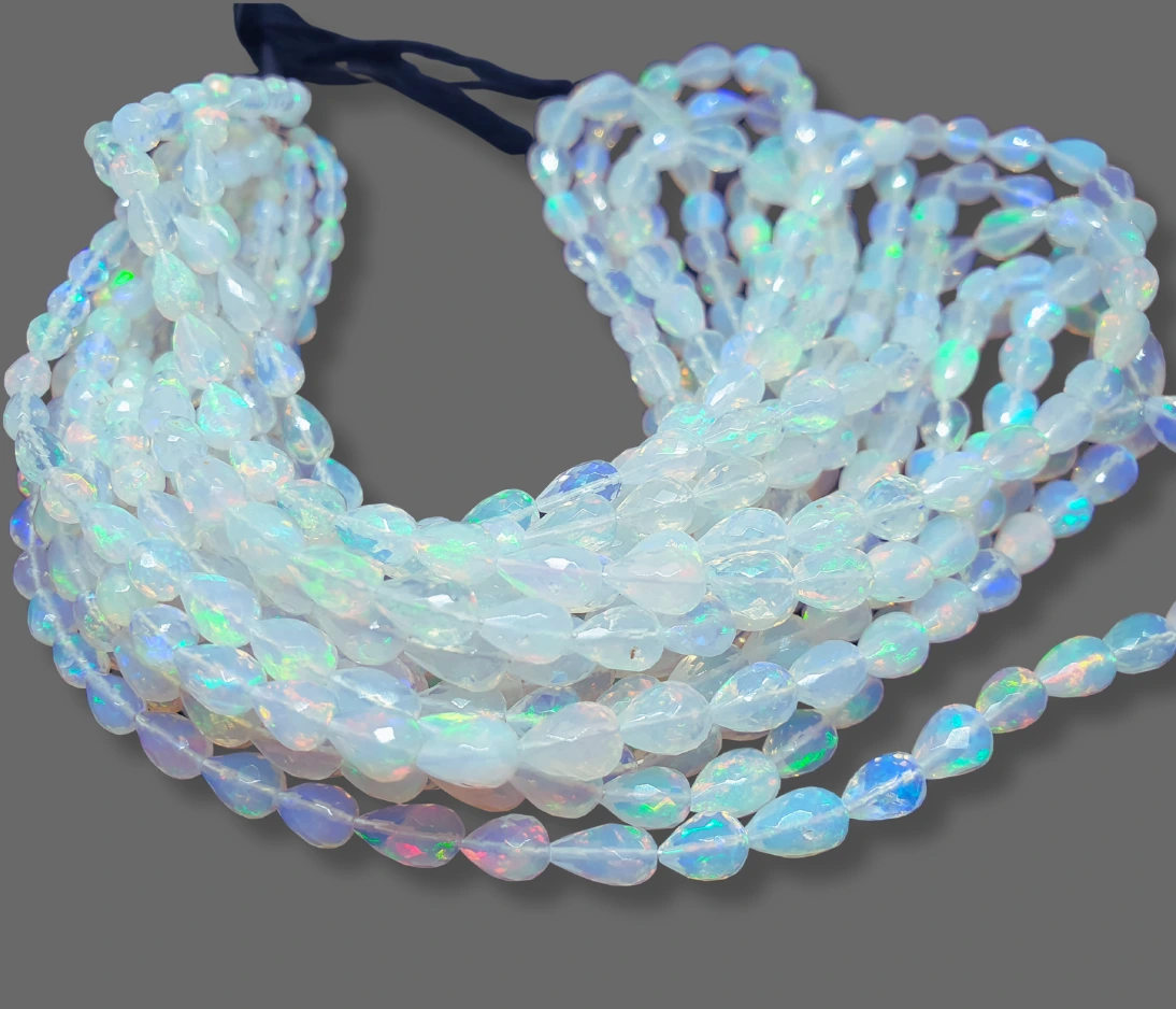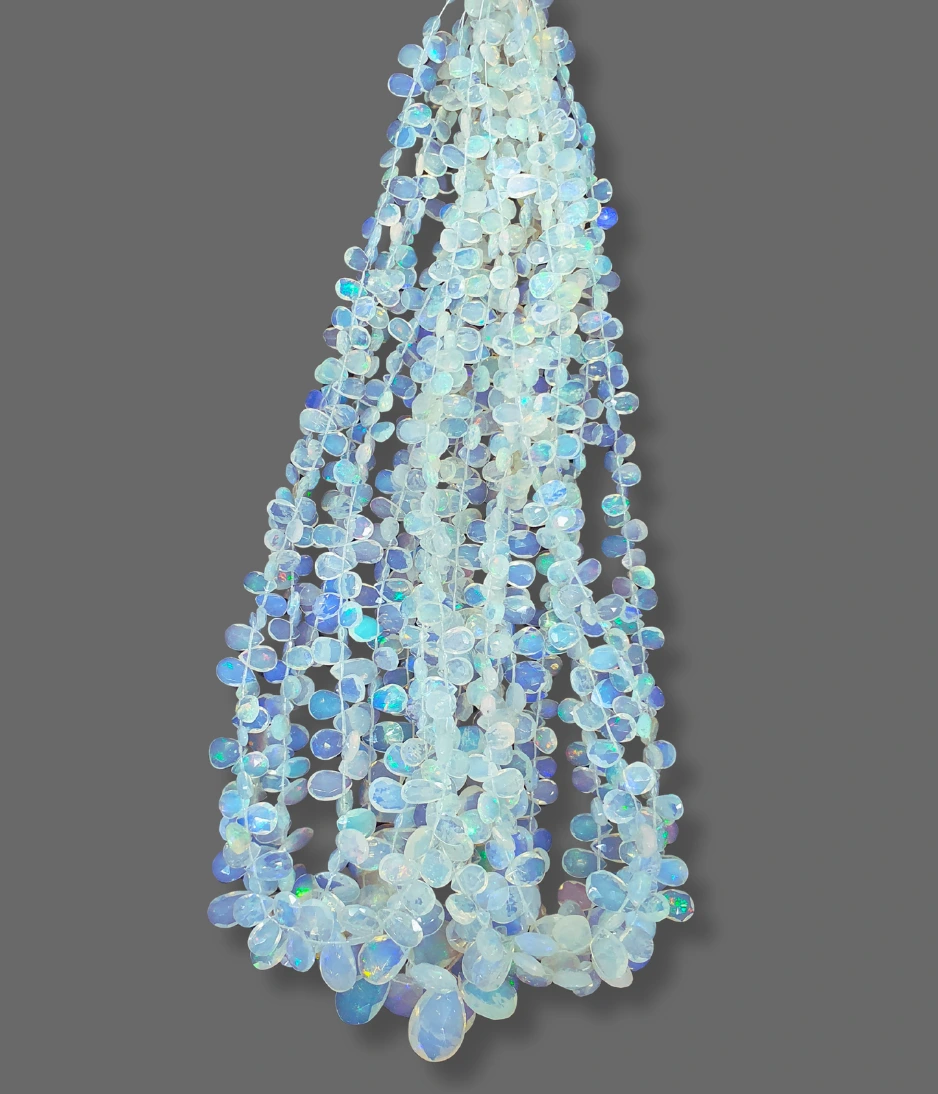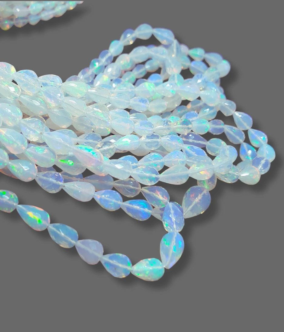 Ethiopian opal beads Known for their vibrant play of colour, these natural gemstones reveal flashes of red, green, orange, and blue that shimmer with every movement. Each bead is carefully cut and polished to showcase its unique fire, making every strand one-of-a-kind.