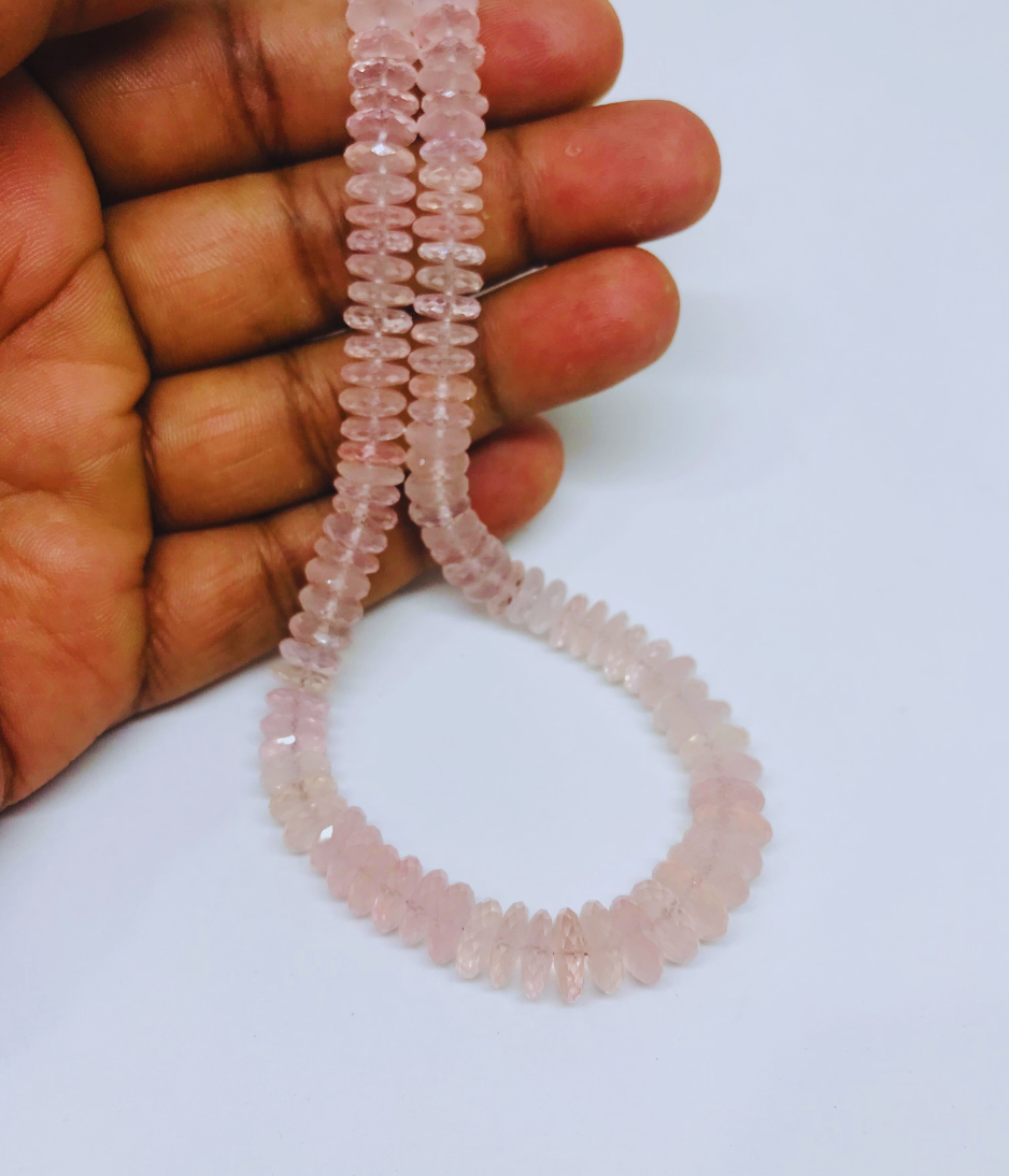 Rose Quartz German Cut Beads Features the delicate blush tones of premium rose quartz, these beads are expertly faceted in the German cut style—bringing refined brilliance and symmetry to one of the most beloved healing stones.